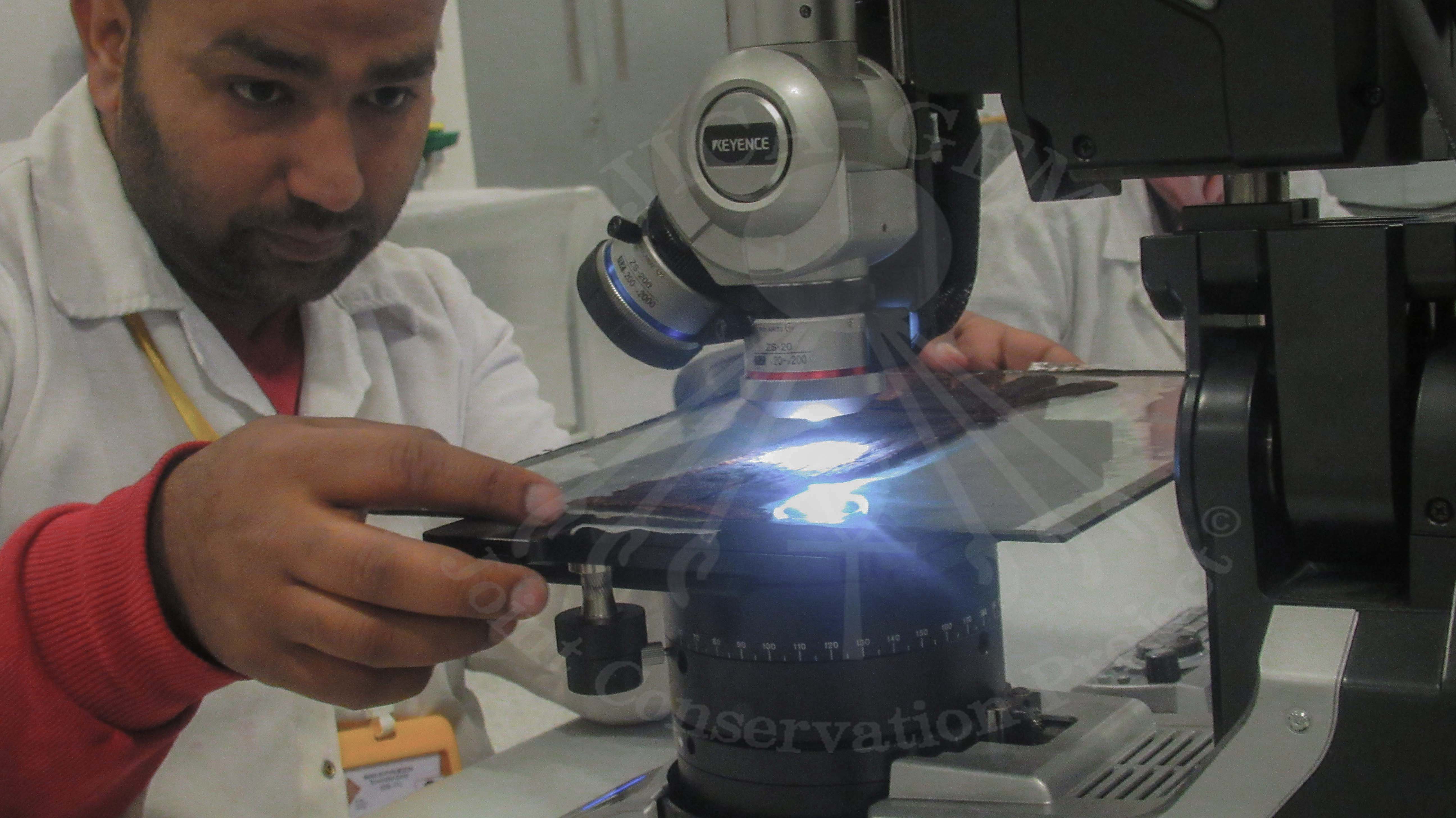 وبأستخدام الميكروسكوب الإلكتروني ، استطاع الخبراء توثيق حالة الغرز و اي مواد غريبة موجودة علي سطح النسيج وتتمثل هذه المواد في بعض الأملاح و الفطريات و الحشرات الميتة التي تبقت داخل النسيج بعد عملية التبخير.