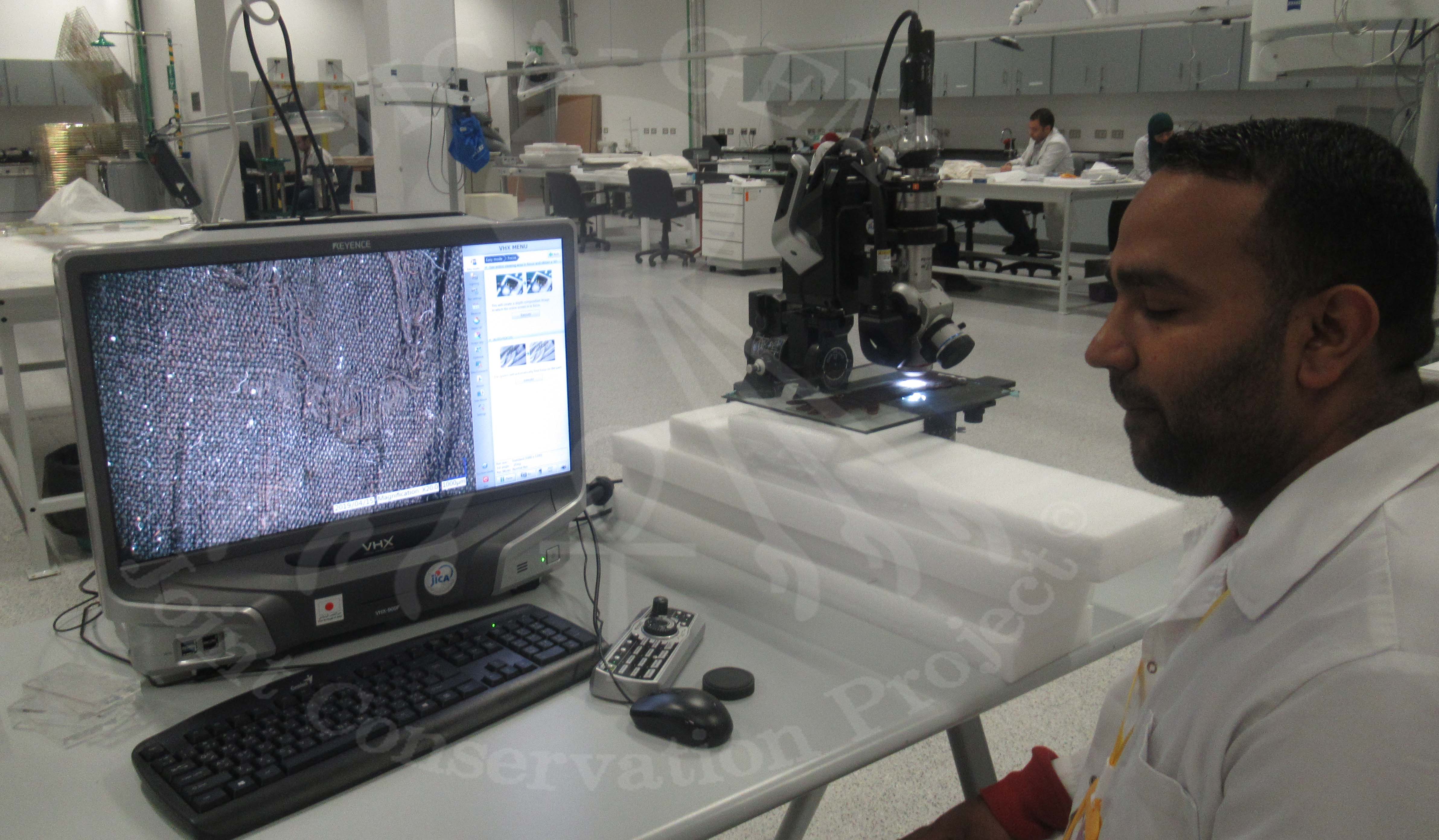 يجري اعضاء معمل الأثار العضوية في مركز الترميم بالمتحف المصري الكبير تحليلا تشخيصيا لمنسوجات الملك توت عنخ آمون ، و ذلك باستخدام ميكروسكوب إلكتروني يتمتع بقدرة تكبيرية تصل إلي x2000 .