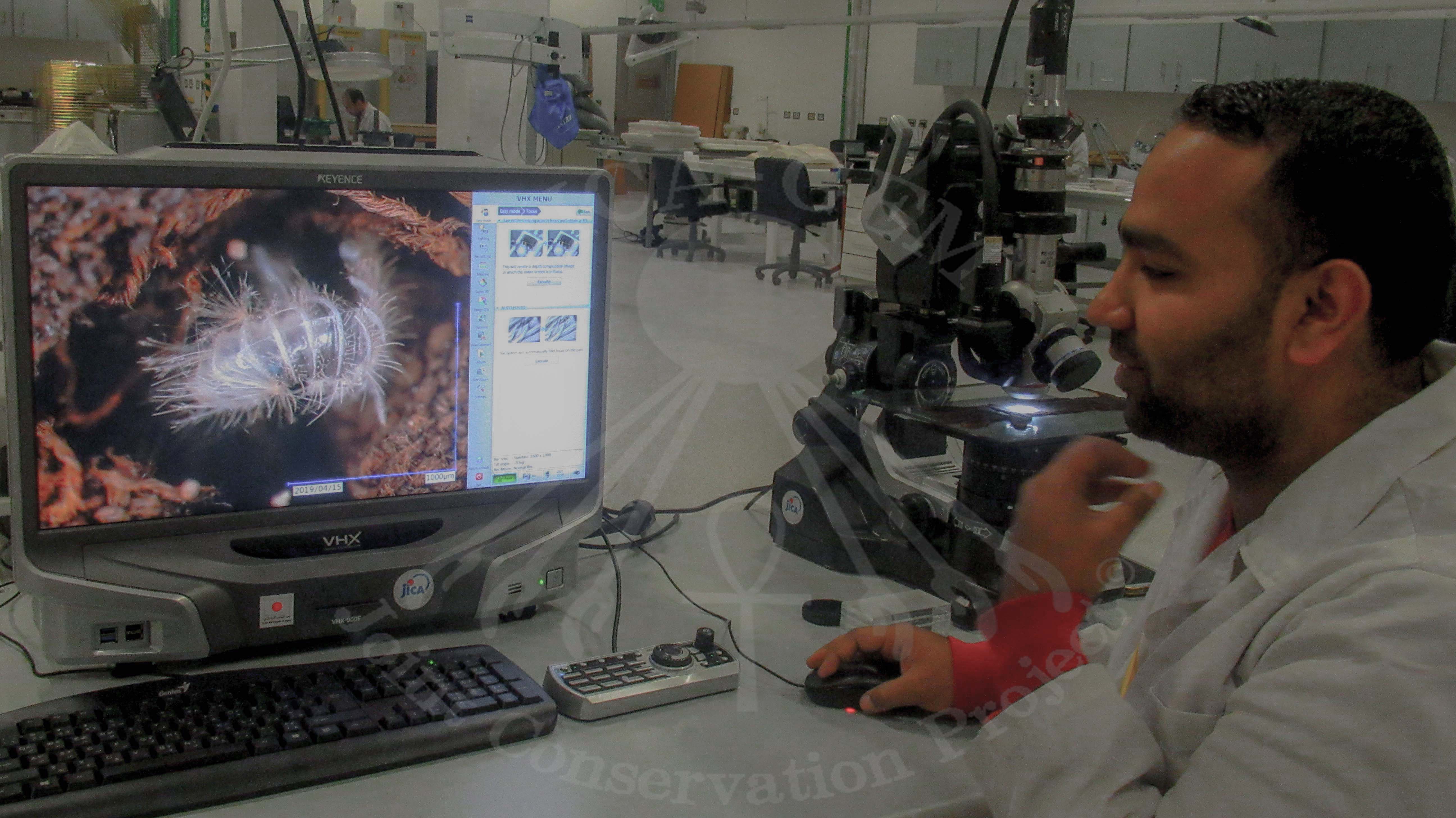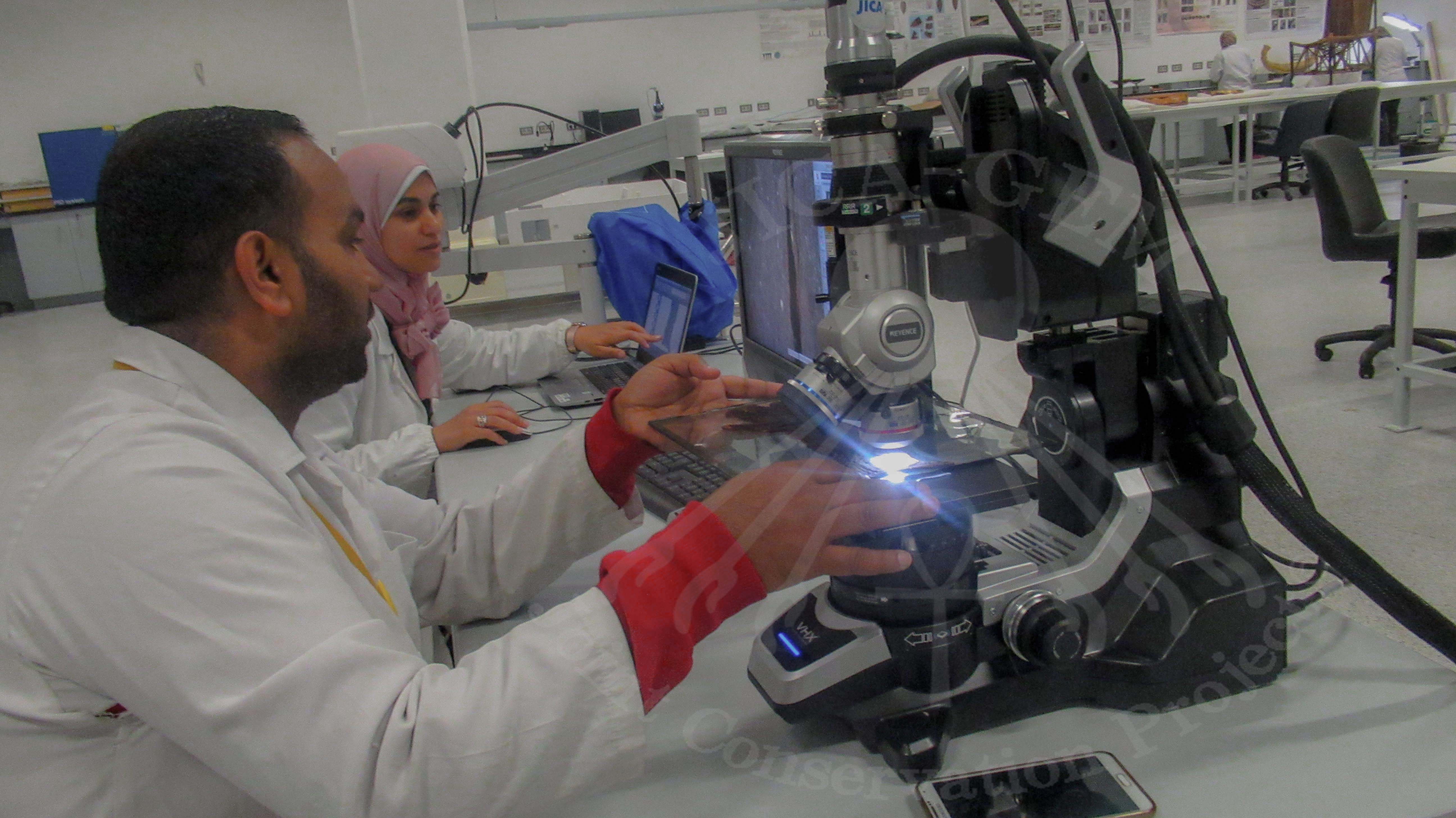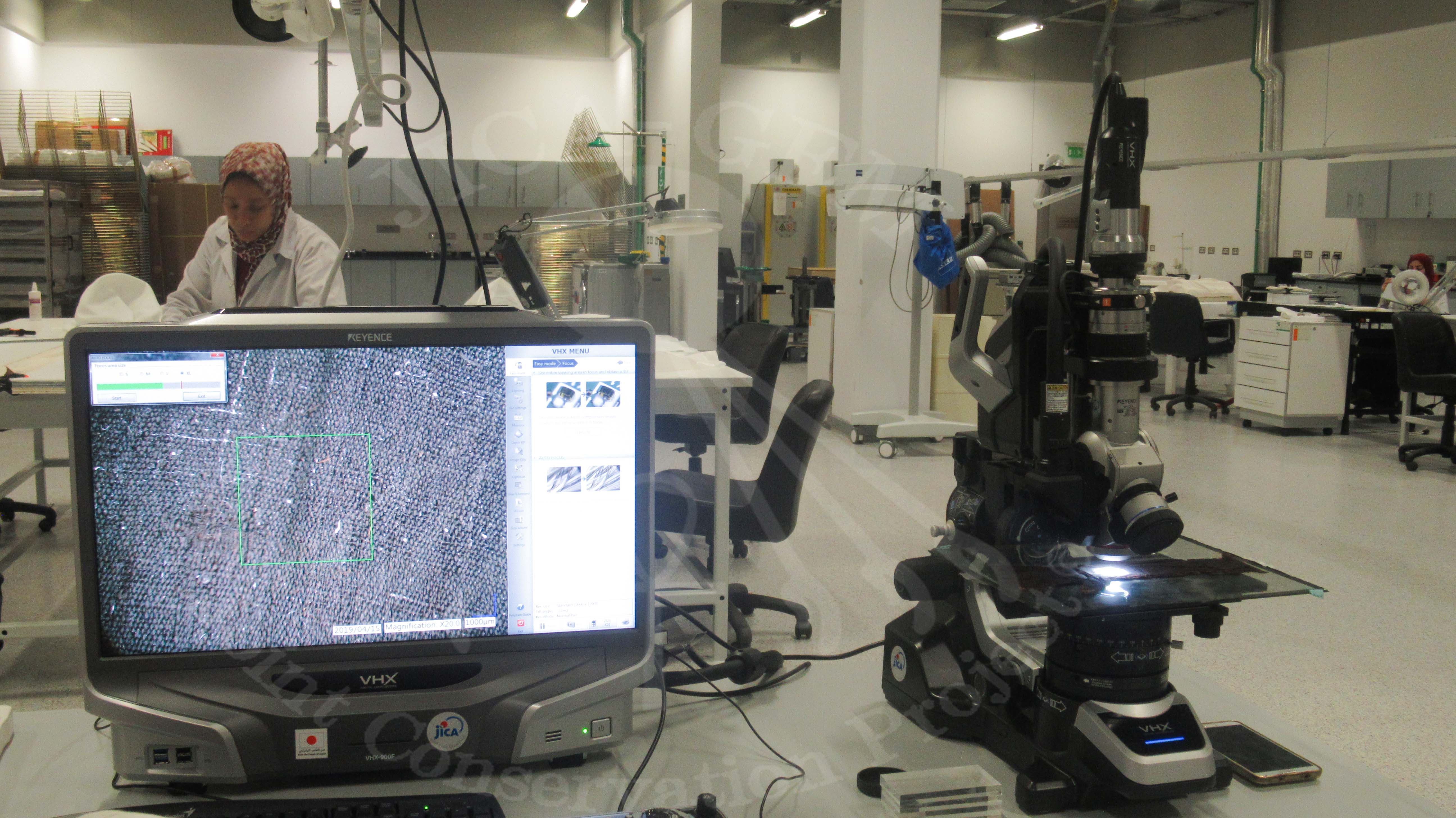 GEM-CCの有機遺物ラボメンバーは、2000倍まで高倍率になるデジタル顕微鏡を用いて染織品遺物の分析診断を実施しています。この分析により染織品の状態をより深く理解することができます。