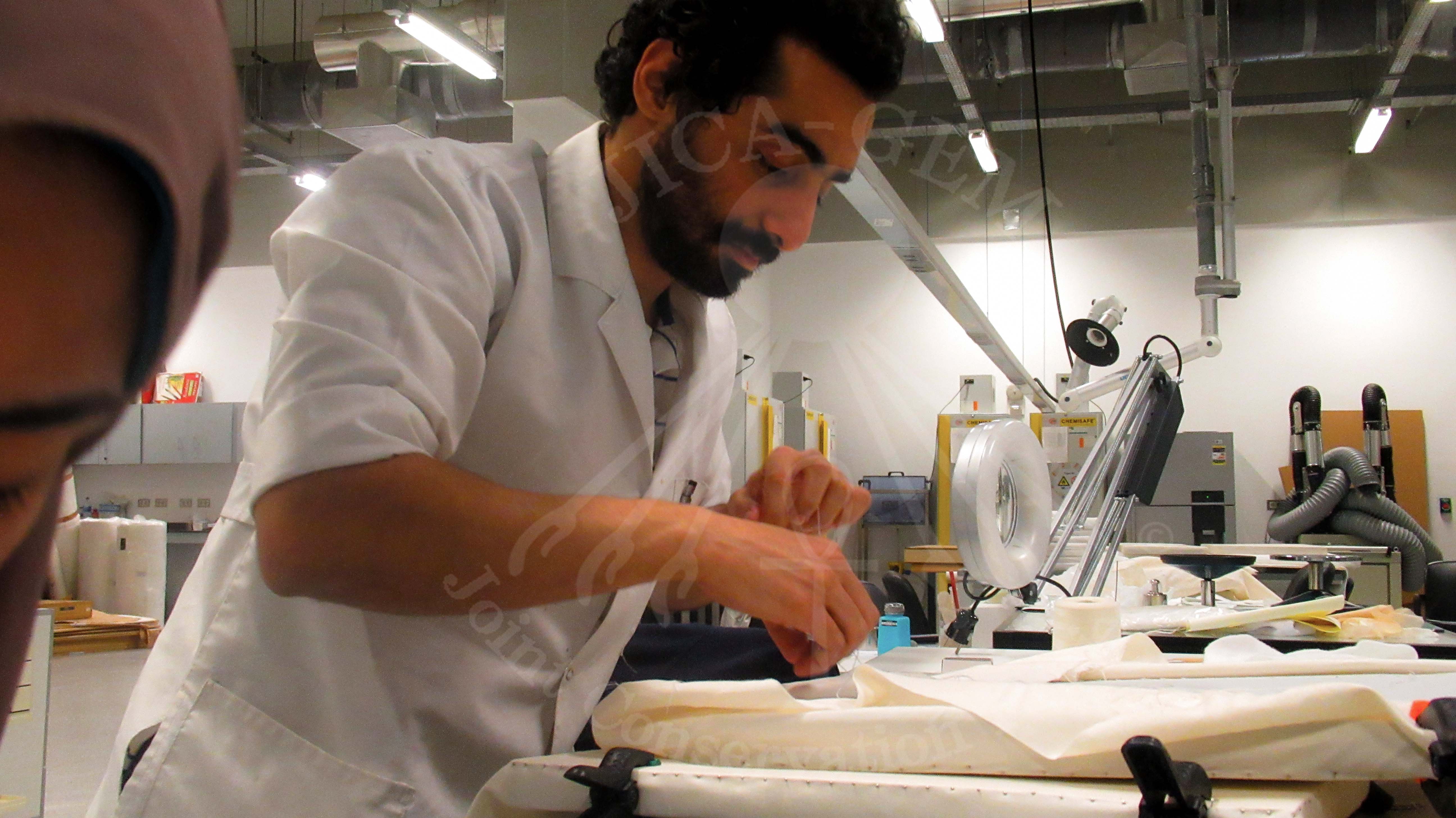 ツタンカーメン王の染織品のマウント(展示台座)の製作がGEM-CCの有機遺物ラボで始まりました。現在、全過程の準備とドキュメンテーションが染織品保存修復の専門家らによって行われています。