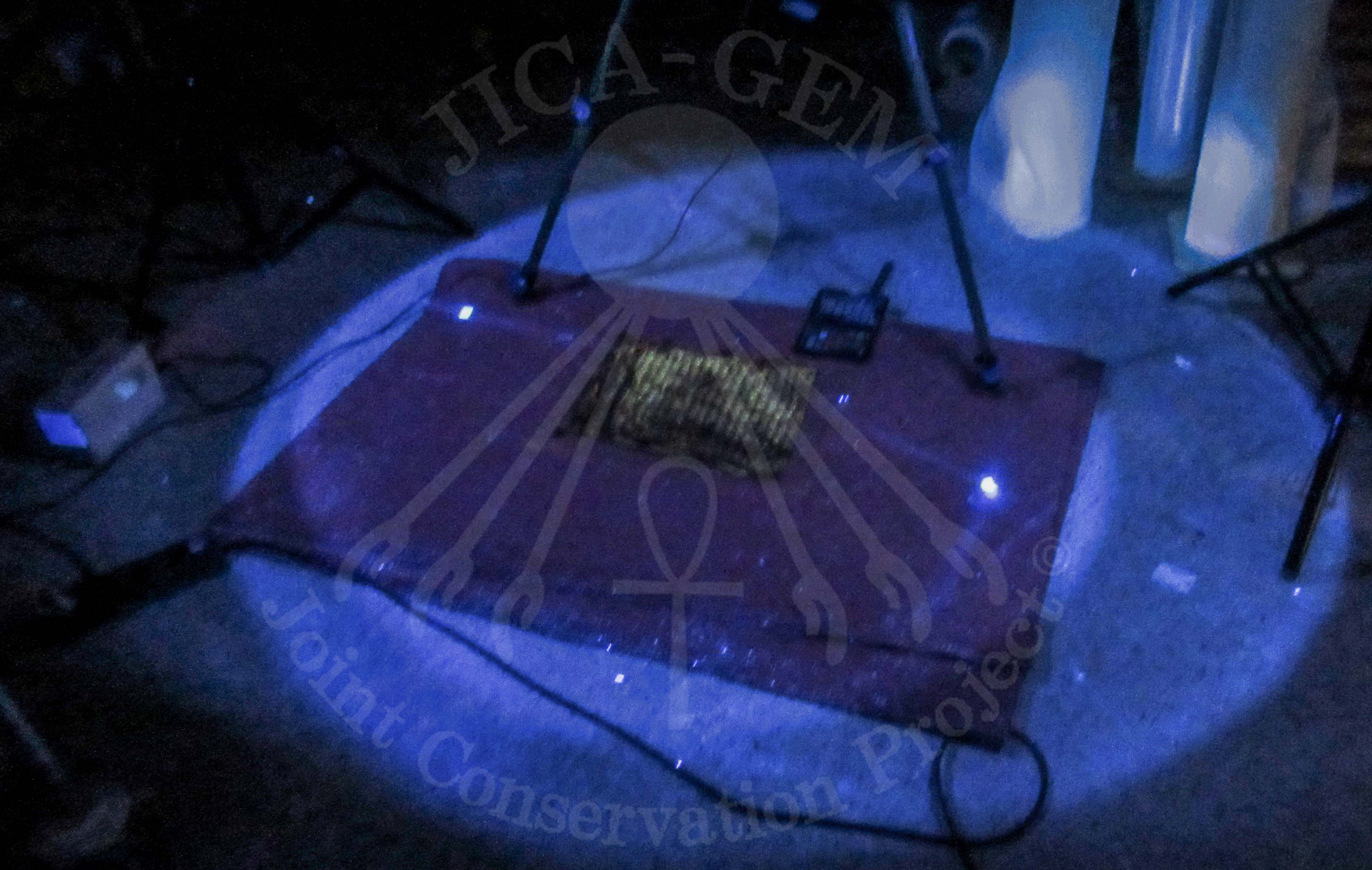 يقوم خبراء مركز الترميم بإجراء تصوير فوتوغرافي متعدد الأطياف على منسوجات الملك توت عنخ آمون ، وذلك للحصول على المزيد من المعلومات حول حالة النسيج وخصائصه وما إلى ذلك ، وهي معلومات أساسية لإنهاء عملية التوثيق.