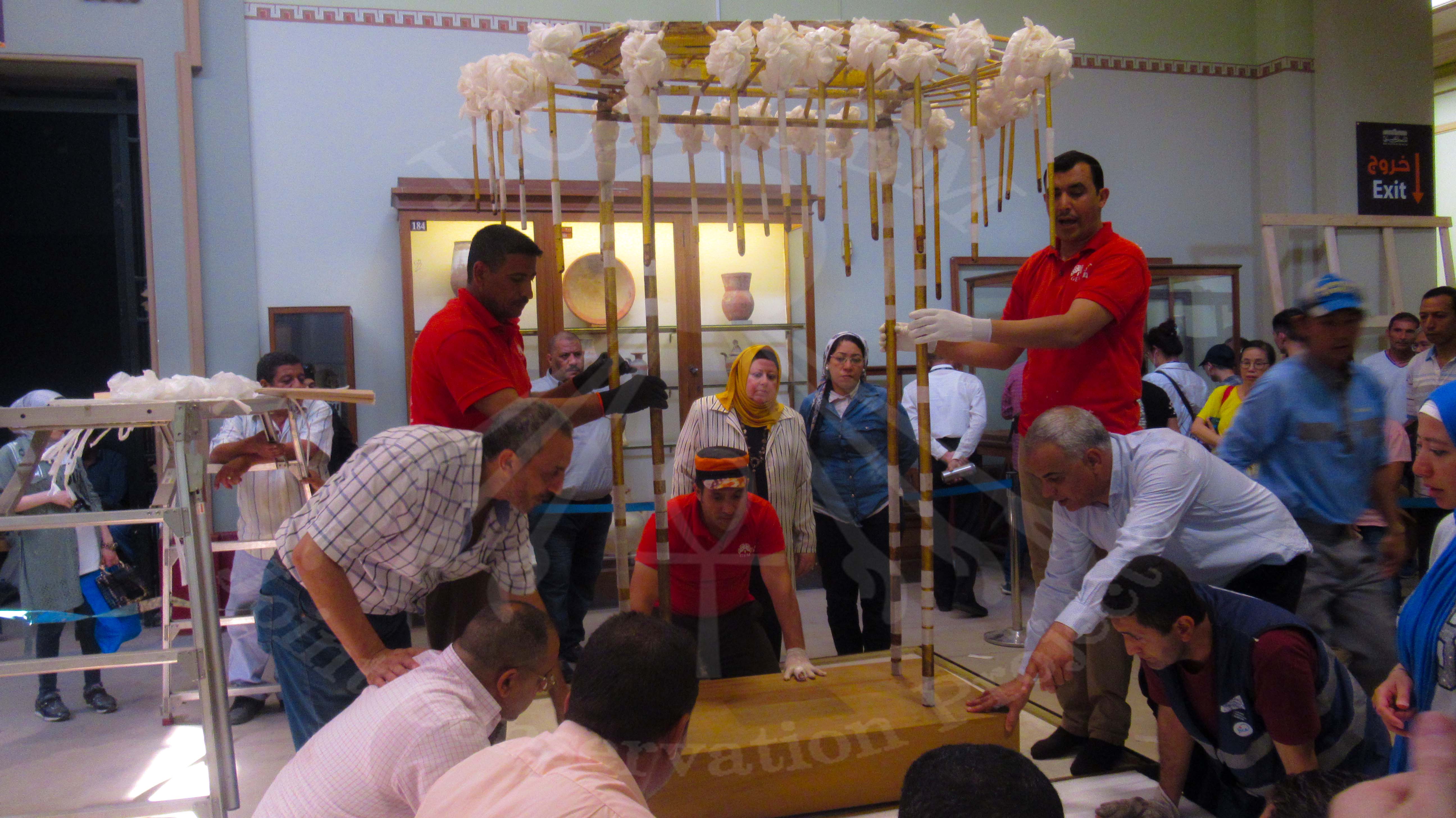 قام أعضاء فريق الترميم المشترك بالمتحف المصري الكبير بإتمام عملية النقل لمظلة الملك توت عنخ آمون.