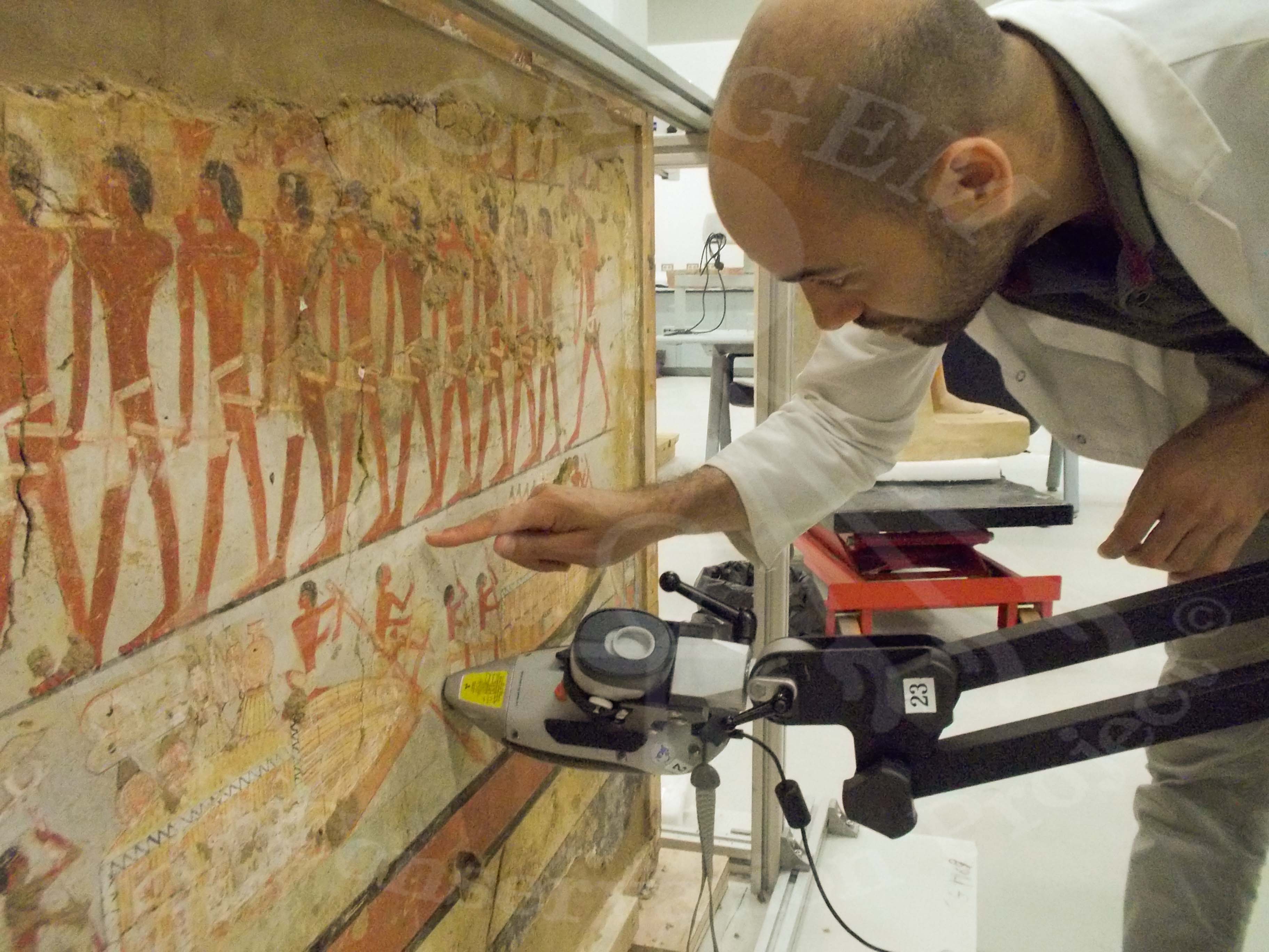 Conservators continued diagnostic analysis at GEM-CC for follow artifacts, using hand held XRF device, which is an elemental analysis instrument that uses X-ray fluorescence technology to identify the elements of the scanned surface, which is the mural paintings in this case.