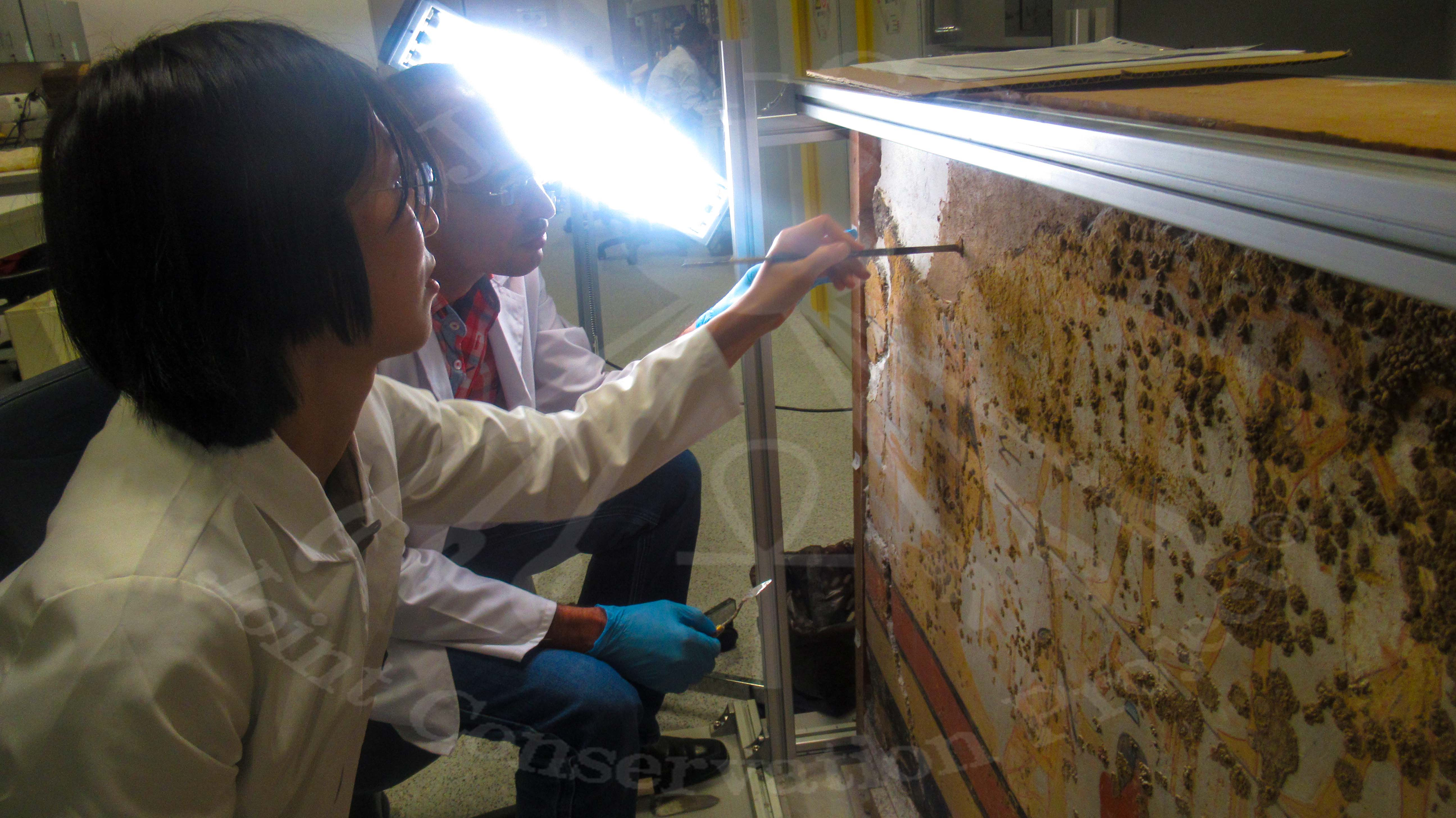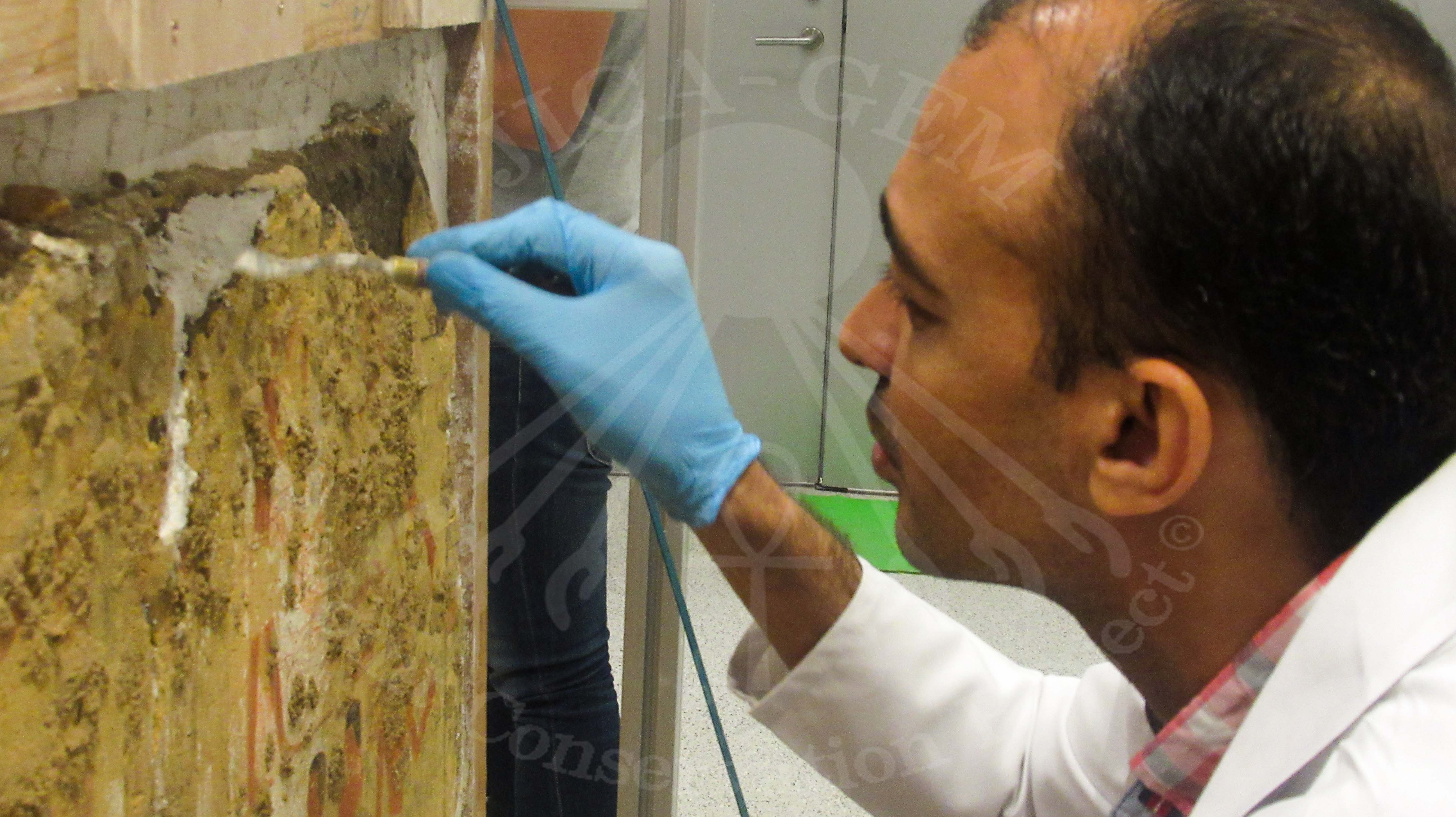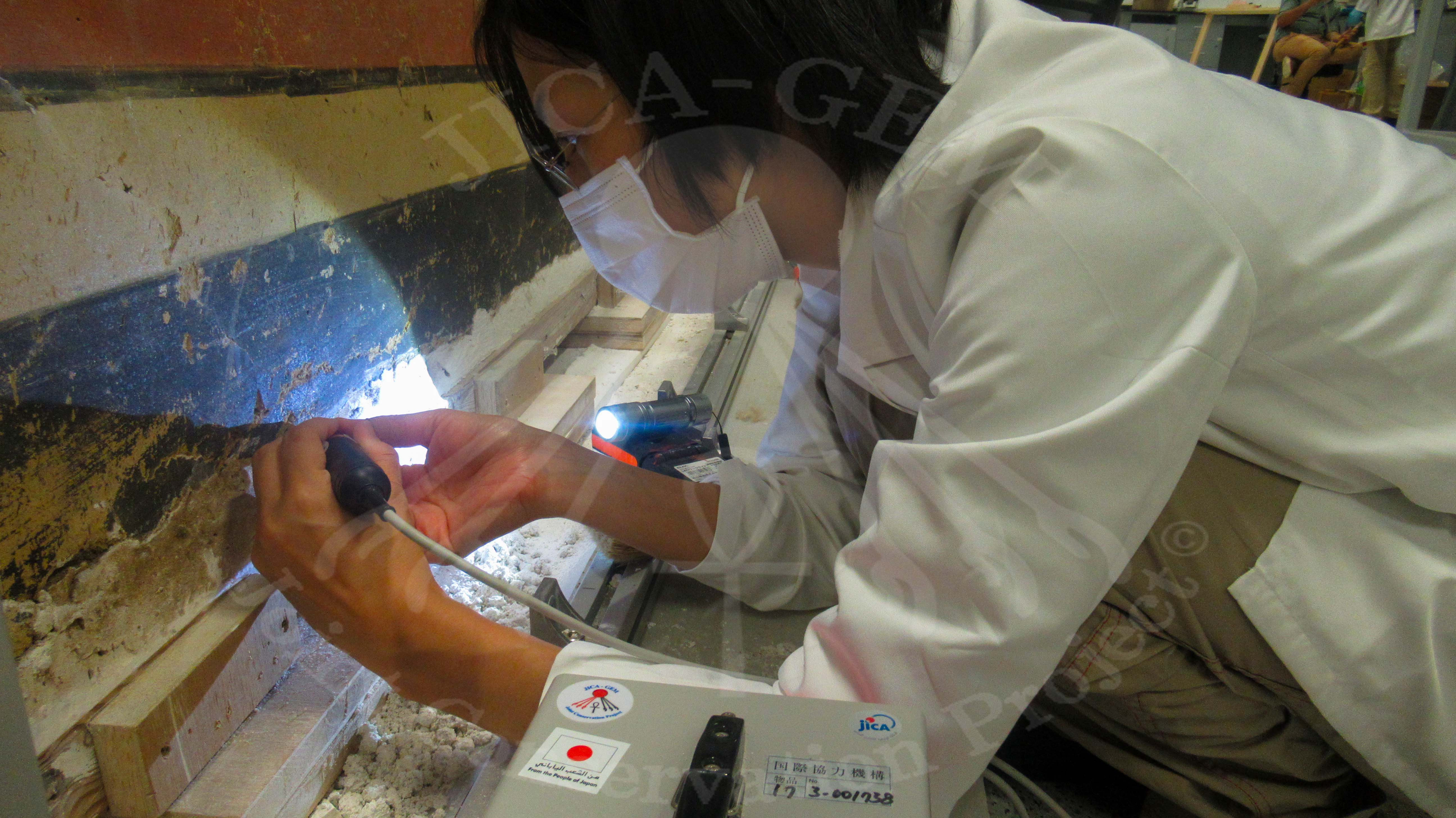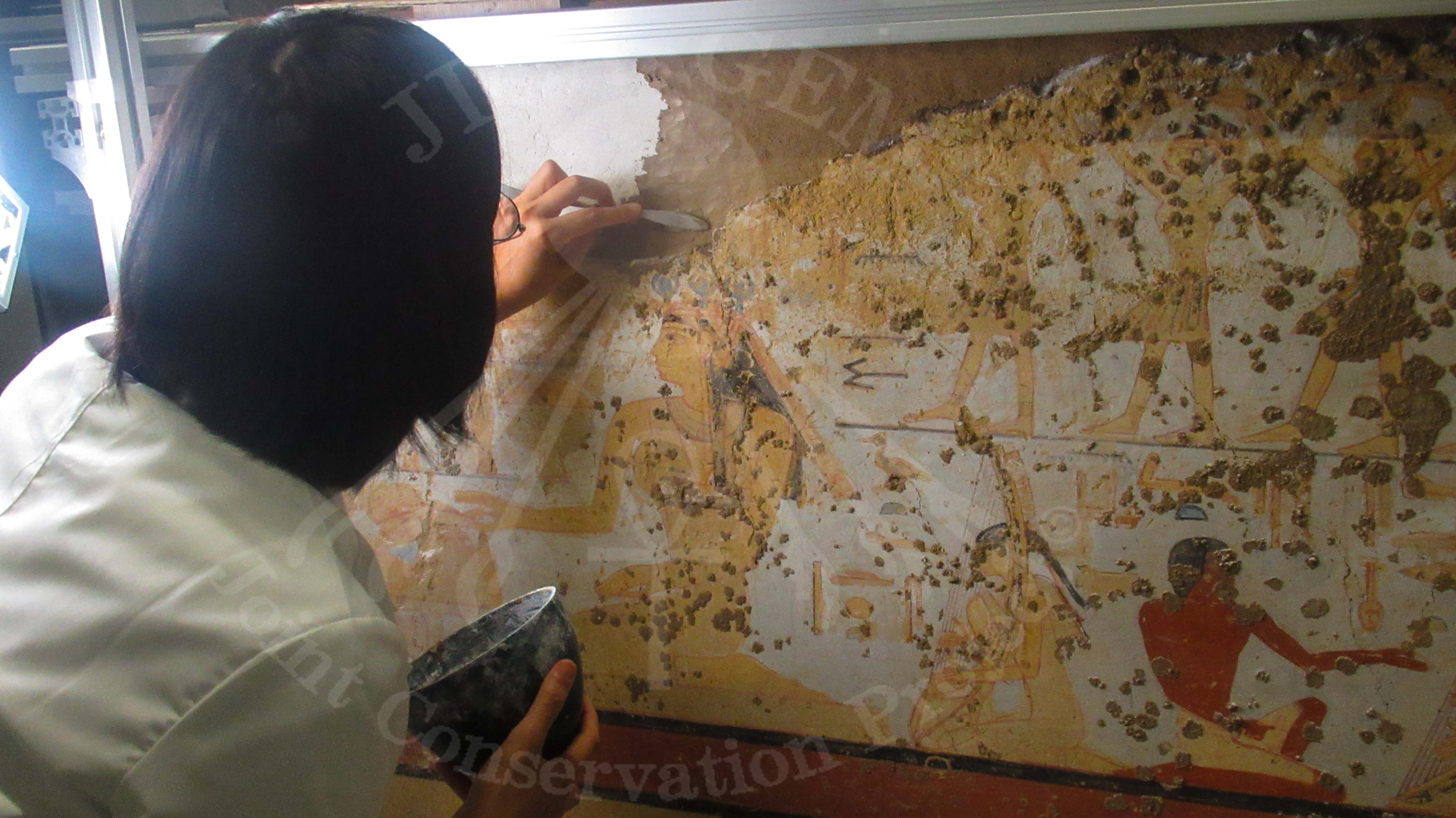 エジプトと日本の保存修復家は、壁画の保存修復の最終工程を行っています。まず専門家がJICAから供与された超音波カッターを使って過去の修復で使用した石膏を除去し、壁画に新しい充填材を塗布しました。この漆喰は化学反応によって壁画に悪影響を及ぼさないよう慎重に修復材料を選びました。