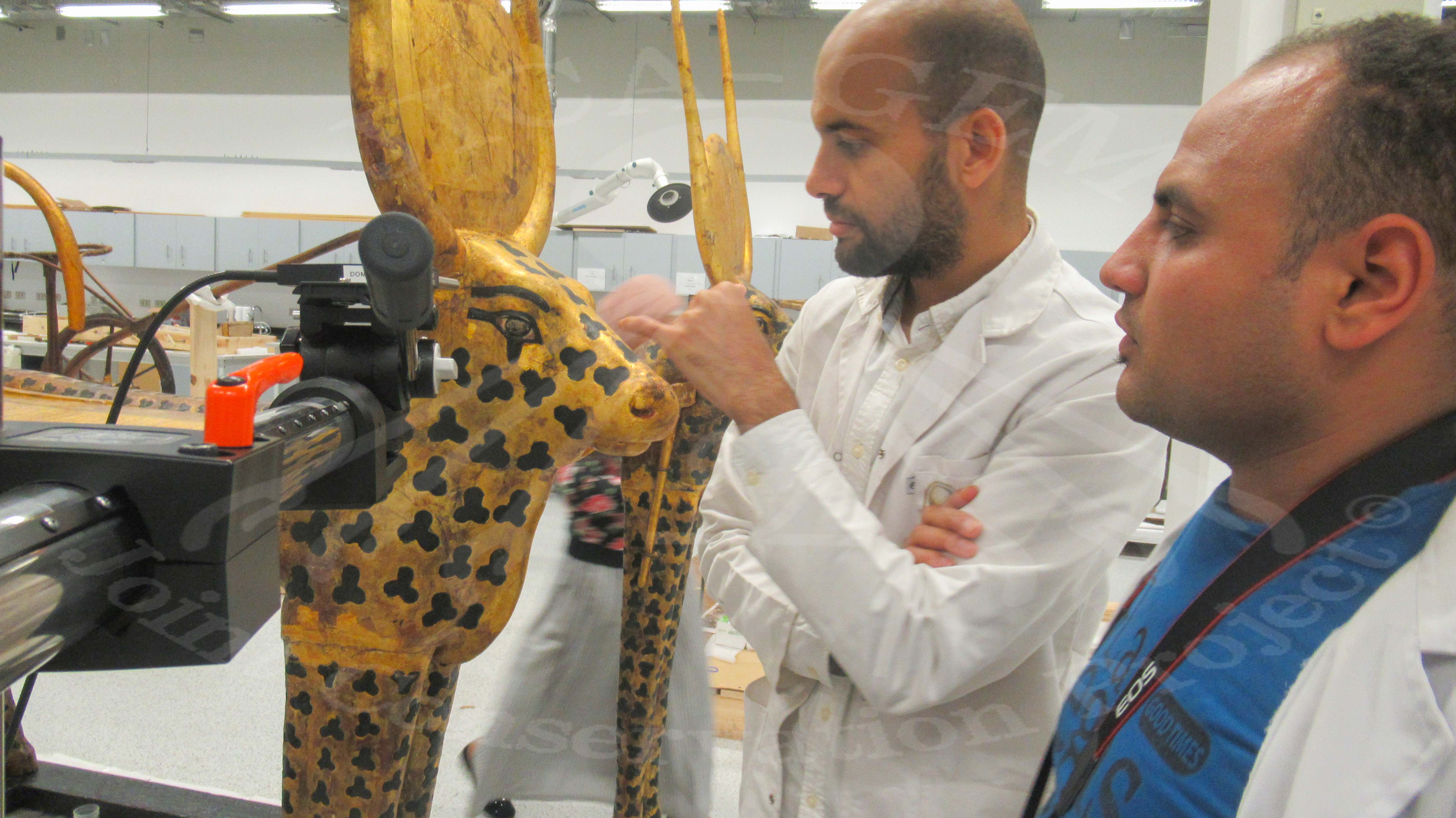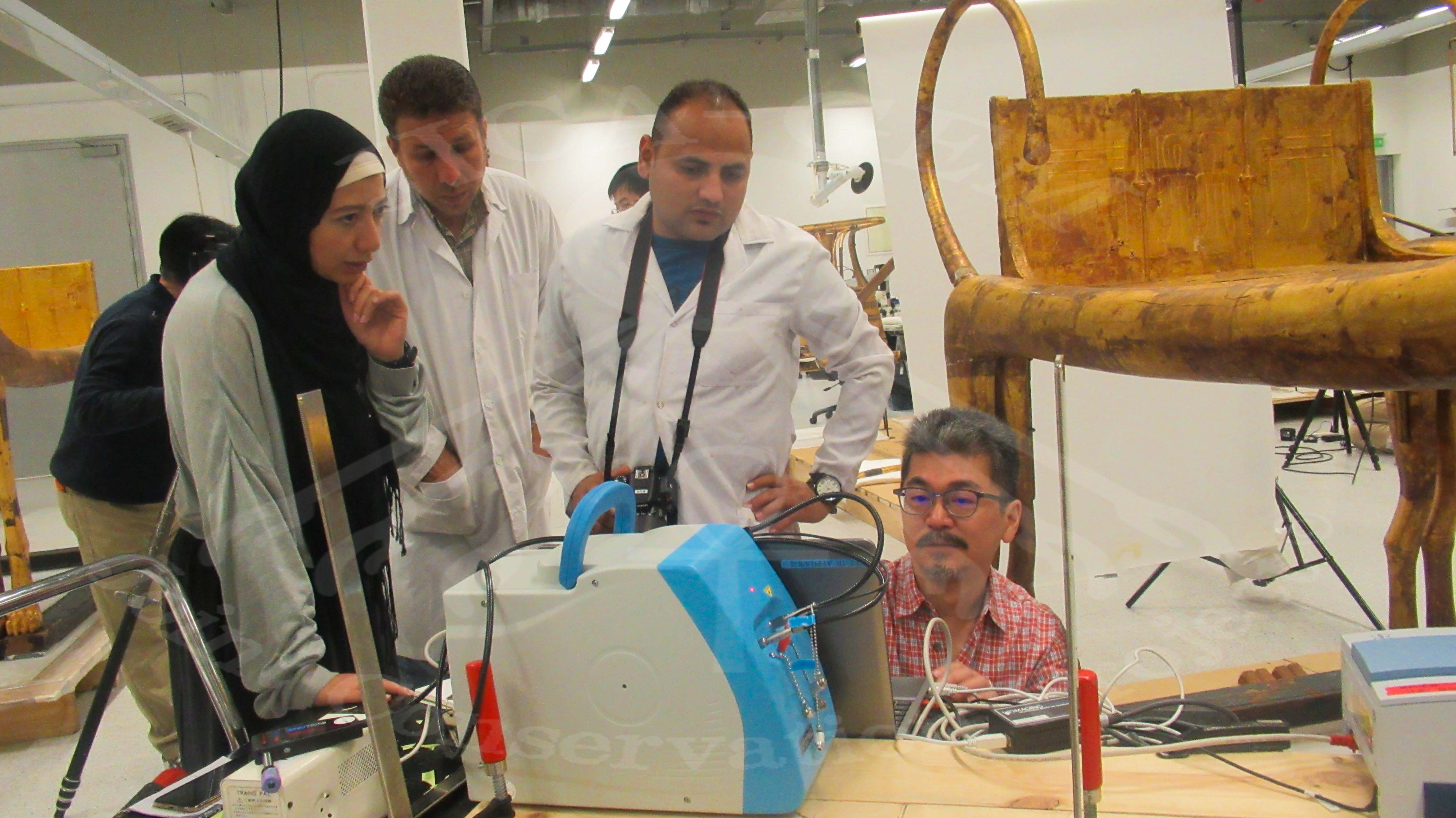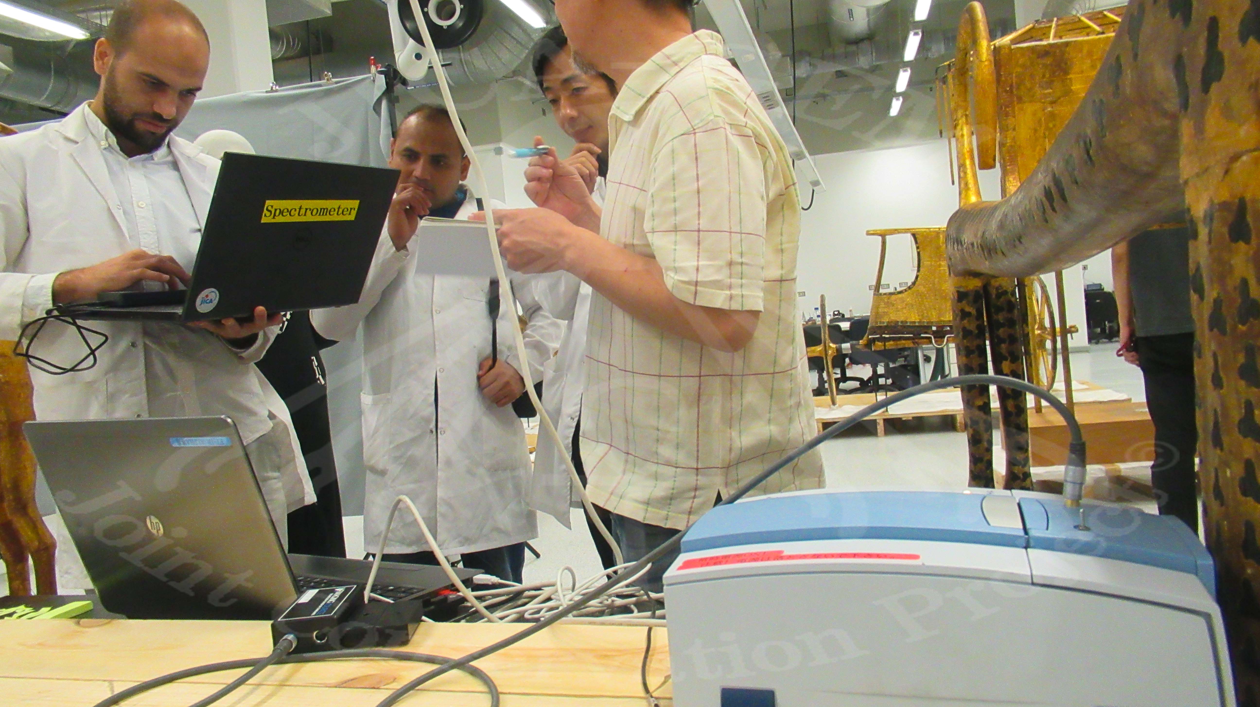 The wood Lab team in GEM-CC is conducting non-destructive analysis on King Tutankhamen’s beds, using portable fourier-transform infrared spectroscopy (FTIR), fibre- optic reflectance spectroscopy (FORS) and Raman spectroscopy, these analyses were based on previous results of multi spectral technique and portable XRF spectrometer.