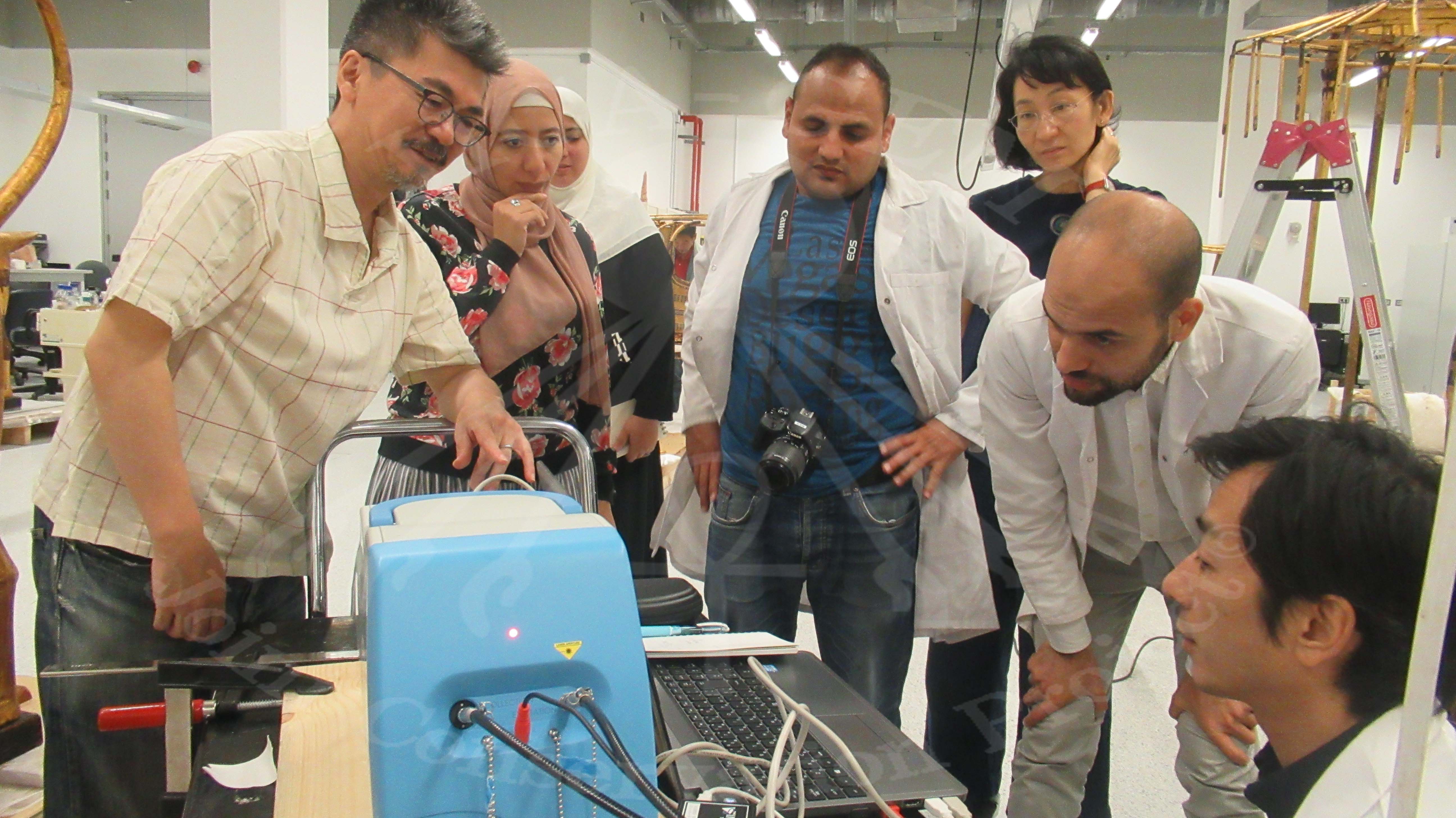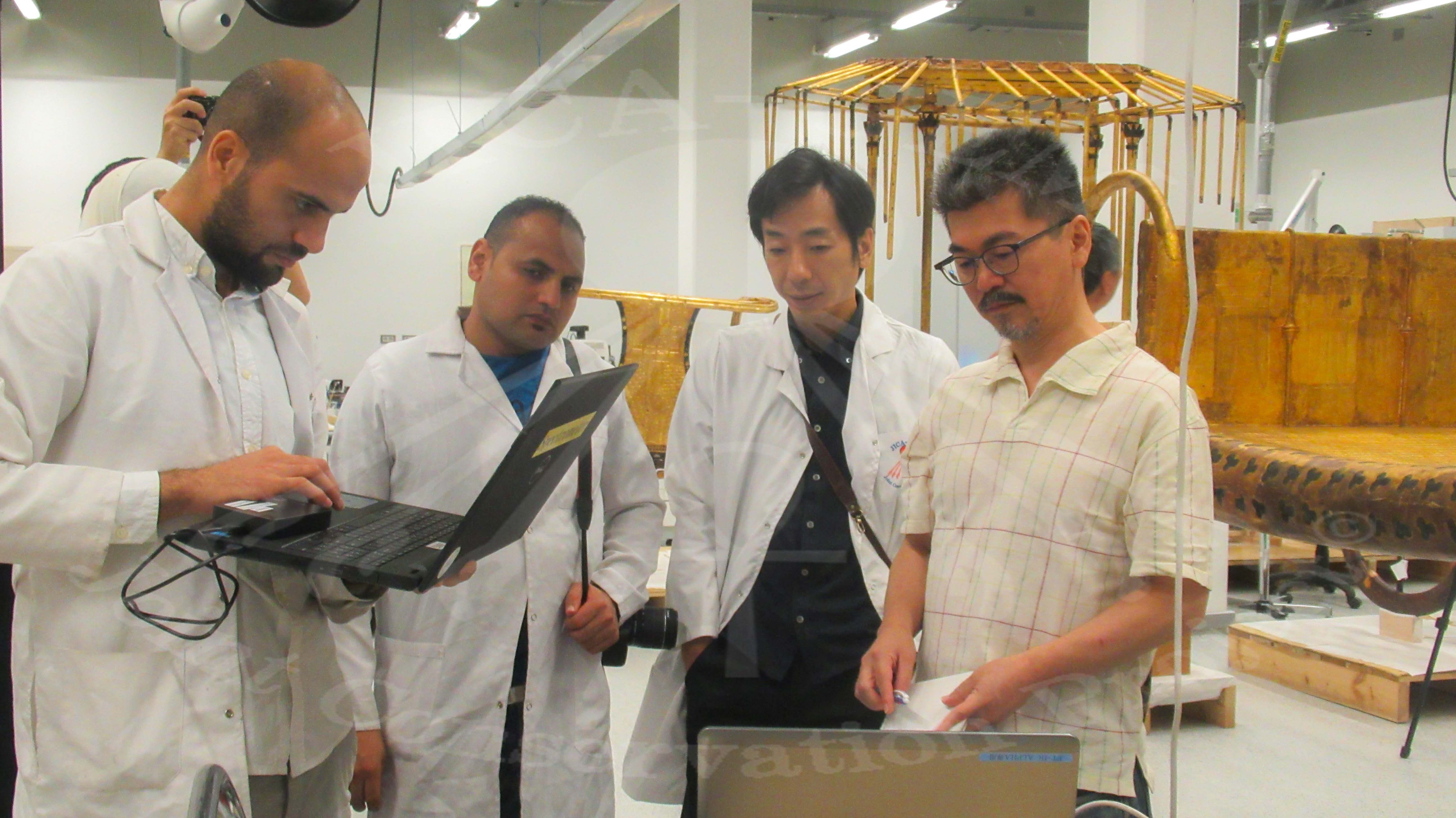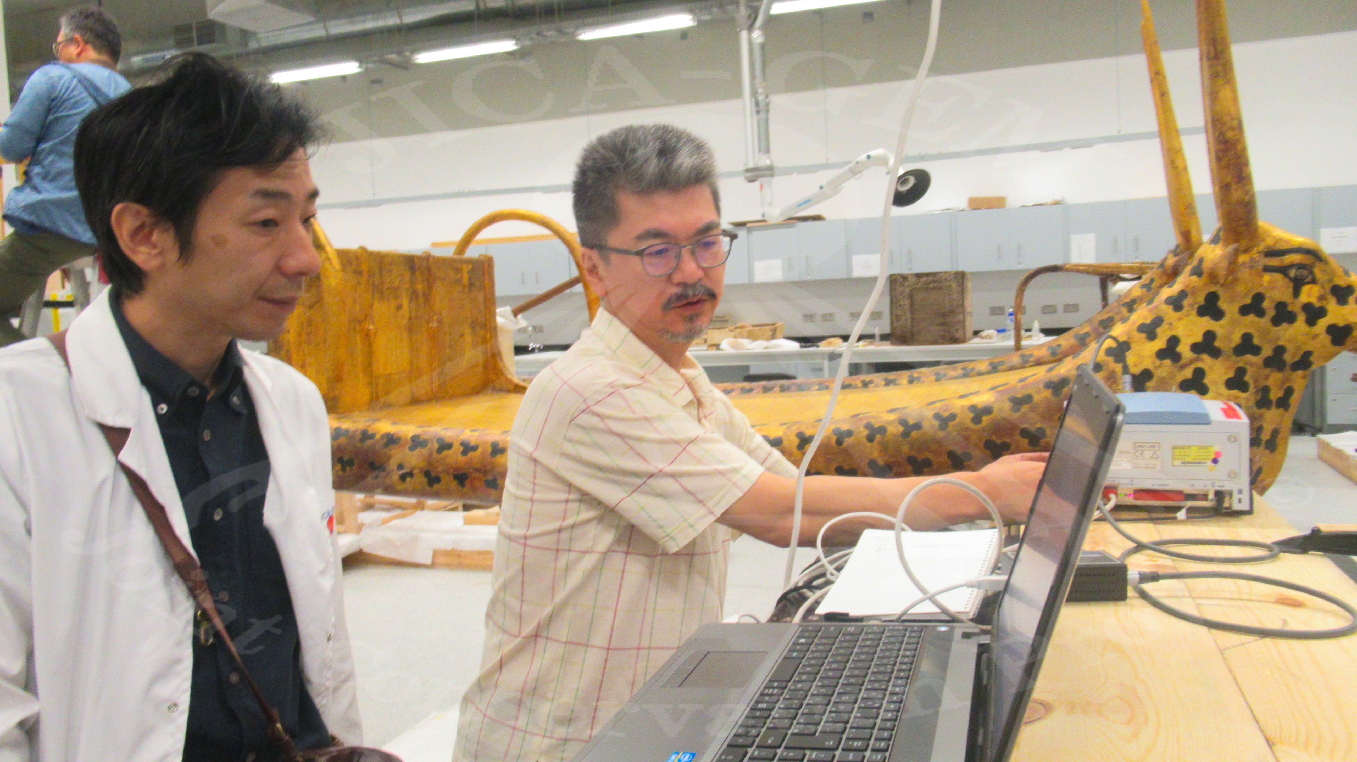 The wood Lab team in GEM-CC is conducting non-destructive analysis on King Tutankhamen’s beds, using portable fourier-transform infrared spectroscopy (FTIR), fibre- optic reflectance spectroscopy (FORS) and Raman spectroscopy, these analyses were based on previous results of multi spectral technique and portable XRF spectrometer.