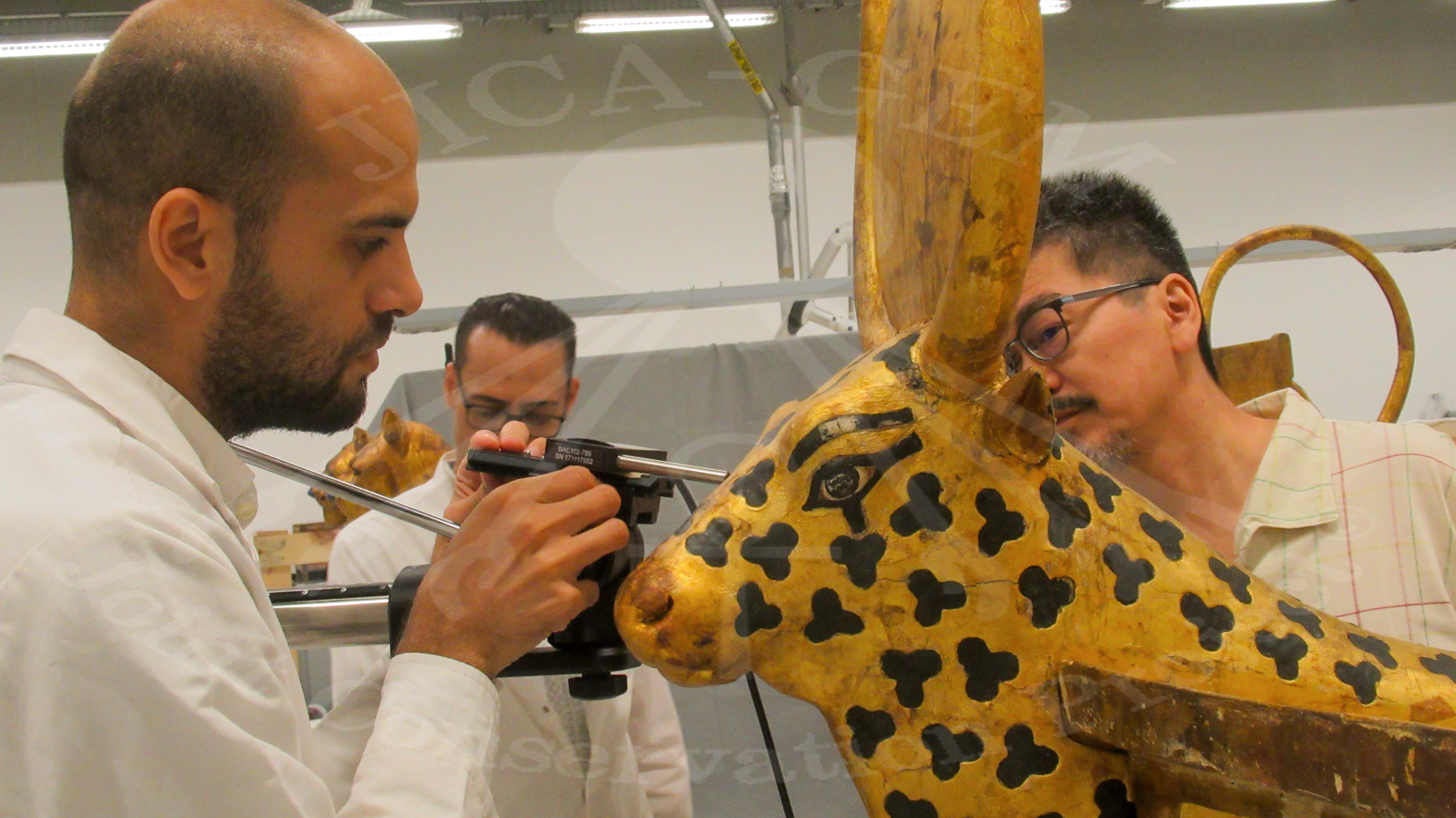The conservators proceeded with diagnostic analysis to investigate the discolored areas on the surface of the gilded bed of Ammut and both the front and the back-right leg of the lion bed, as well as investigating the dark blue pigment on the funerary cow bed, using FORS and Raman spectroscopy.